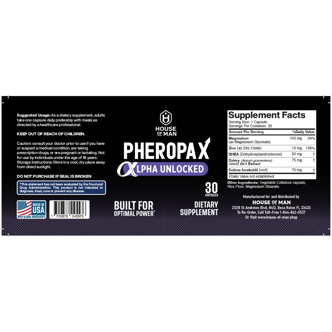 Pheropax is designed for men seeking renewed strength, confidence, and stamina. Featuring DHEA to naturally support testosterone levels, Zinc and Magnesium to enhance energy and recovery, and a blend of Celery seed and Coleus forskohlii for vitality and blood flow—this advanced formula helps men feel younger, stronger, and more driven.